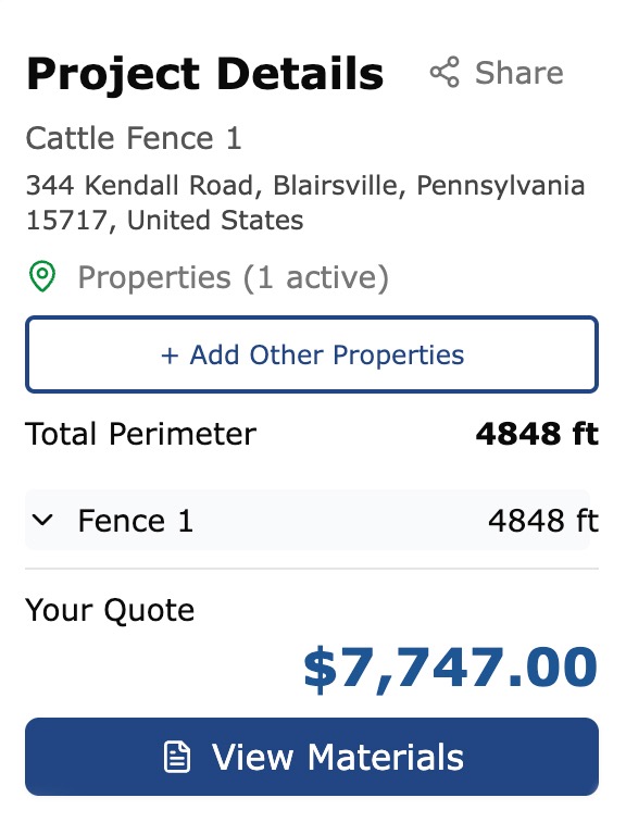 Every post, roll of wire, insulator, brace, and gate updates instantly as you draw.